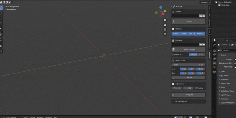 Transfer your camera, solids, and nulls from After Effects to Blender β perfectly aligned with animation and focal length.